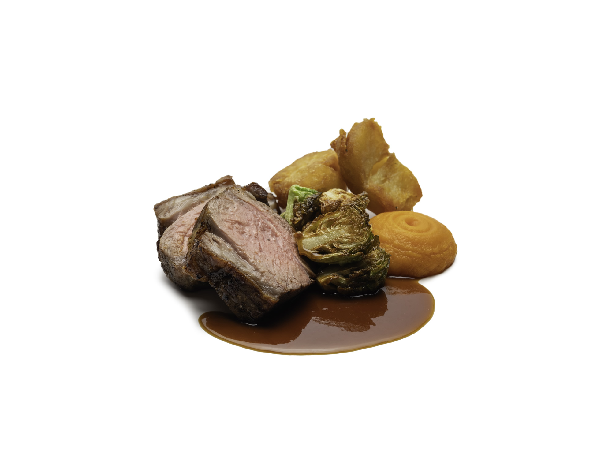 Roast Chump Of Lamb, Duck Fat Roast Potatoes, Carrot Purée, Sprouts and Gravy